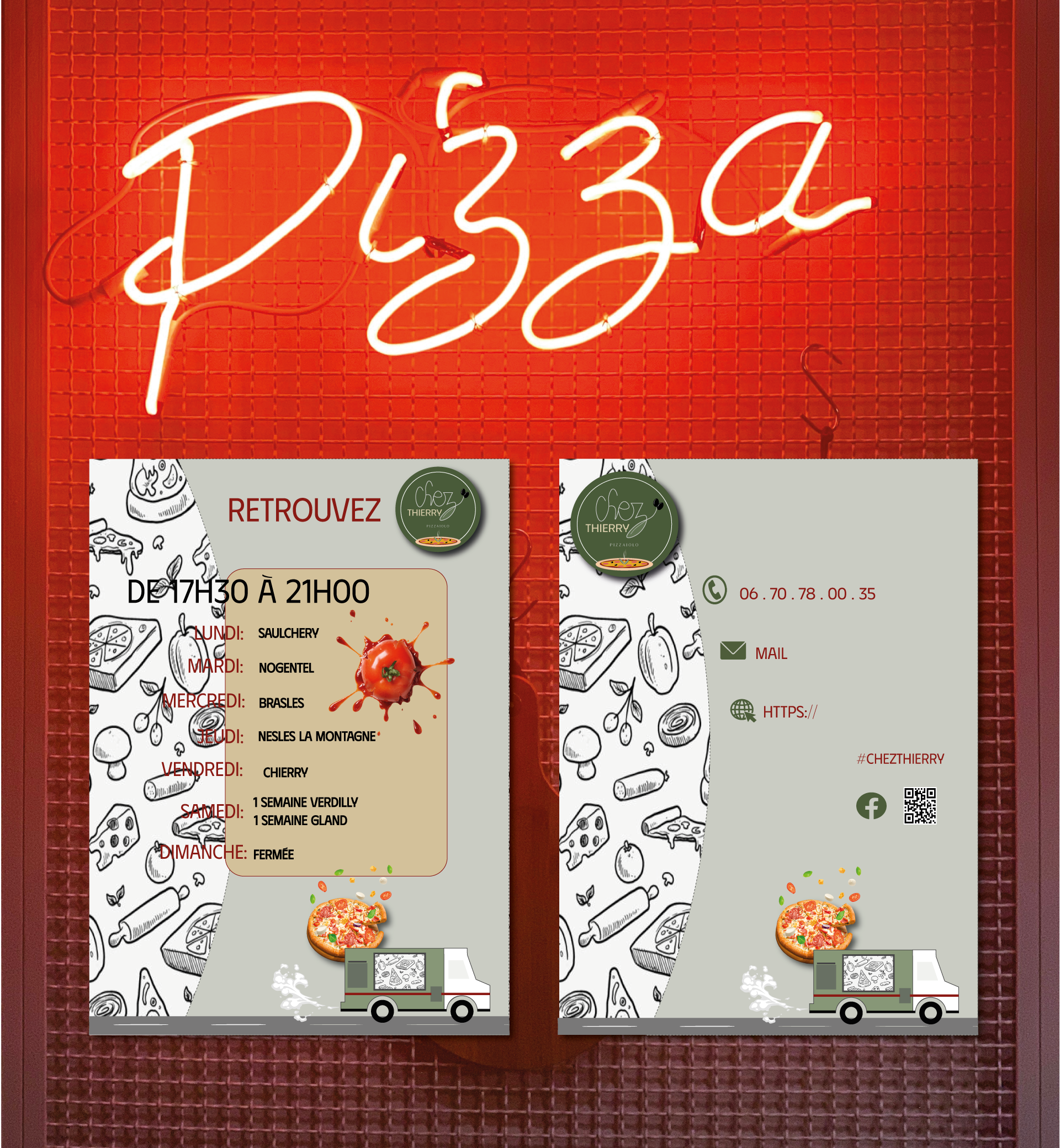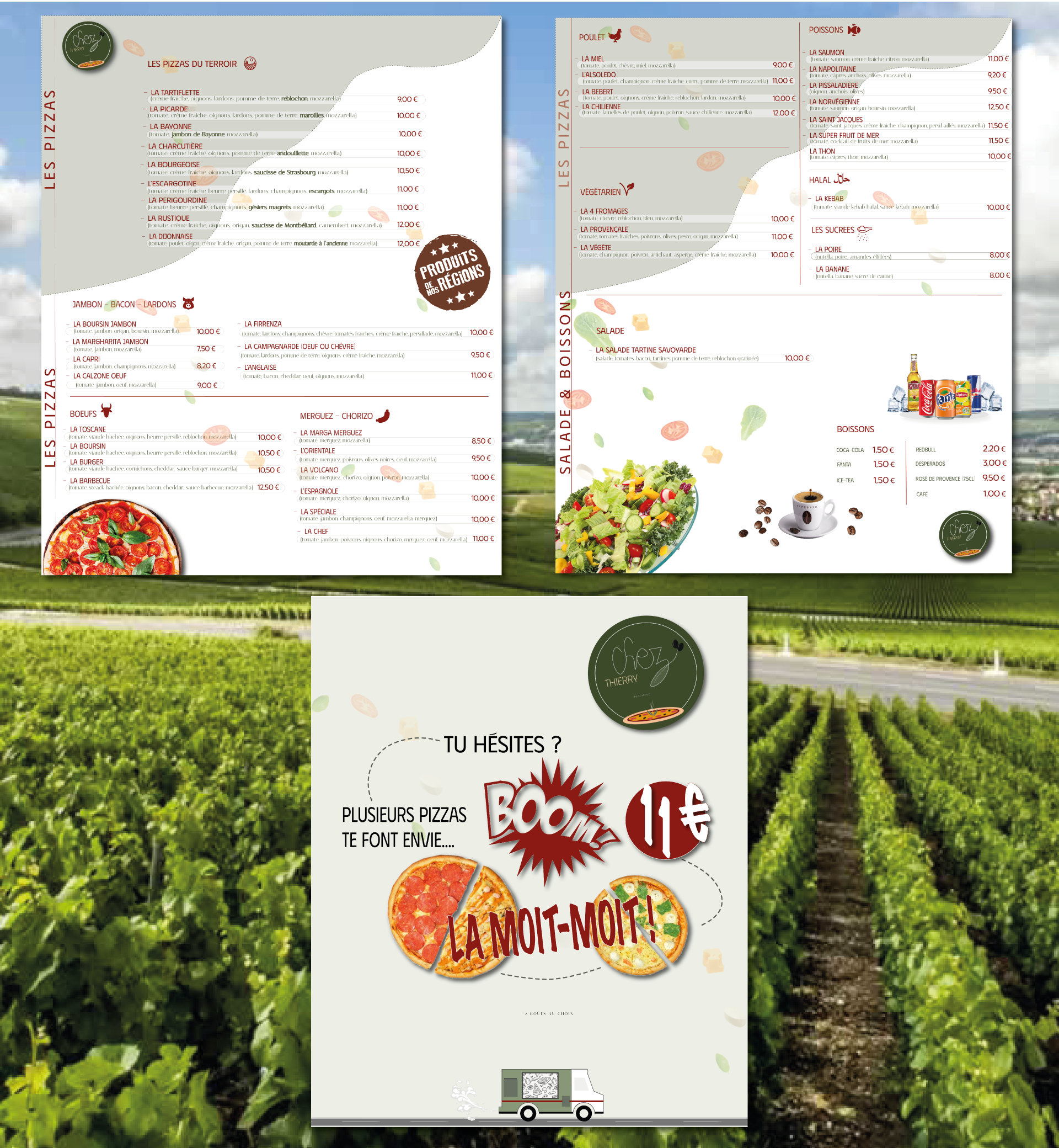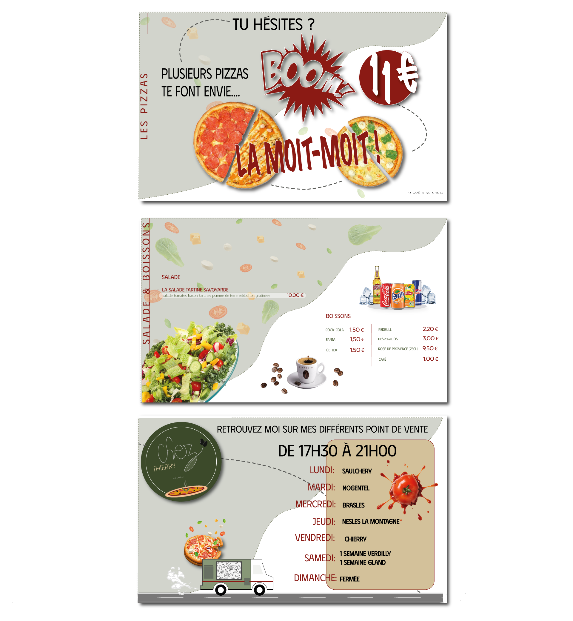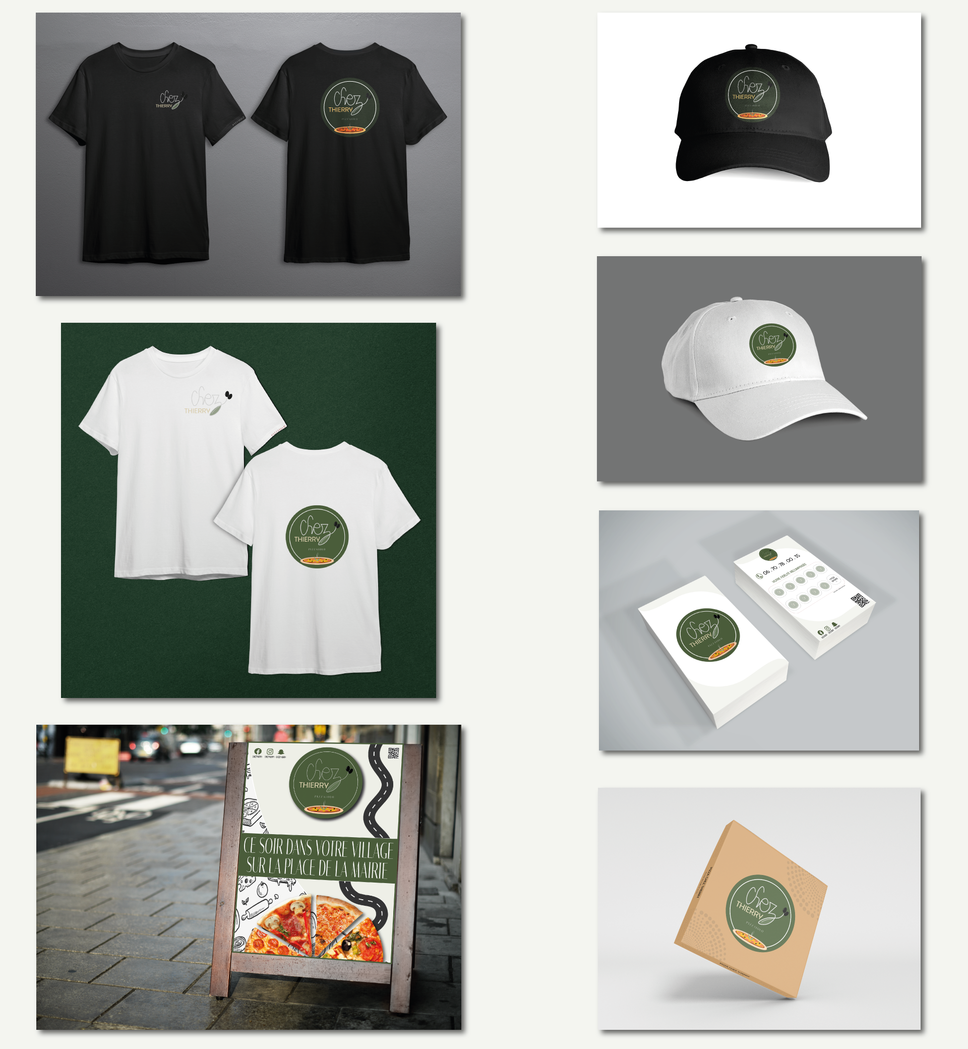 T-Shirts, Casquettes, Boîte à pizzas, Carte de visite et panneau d'affichage.
