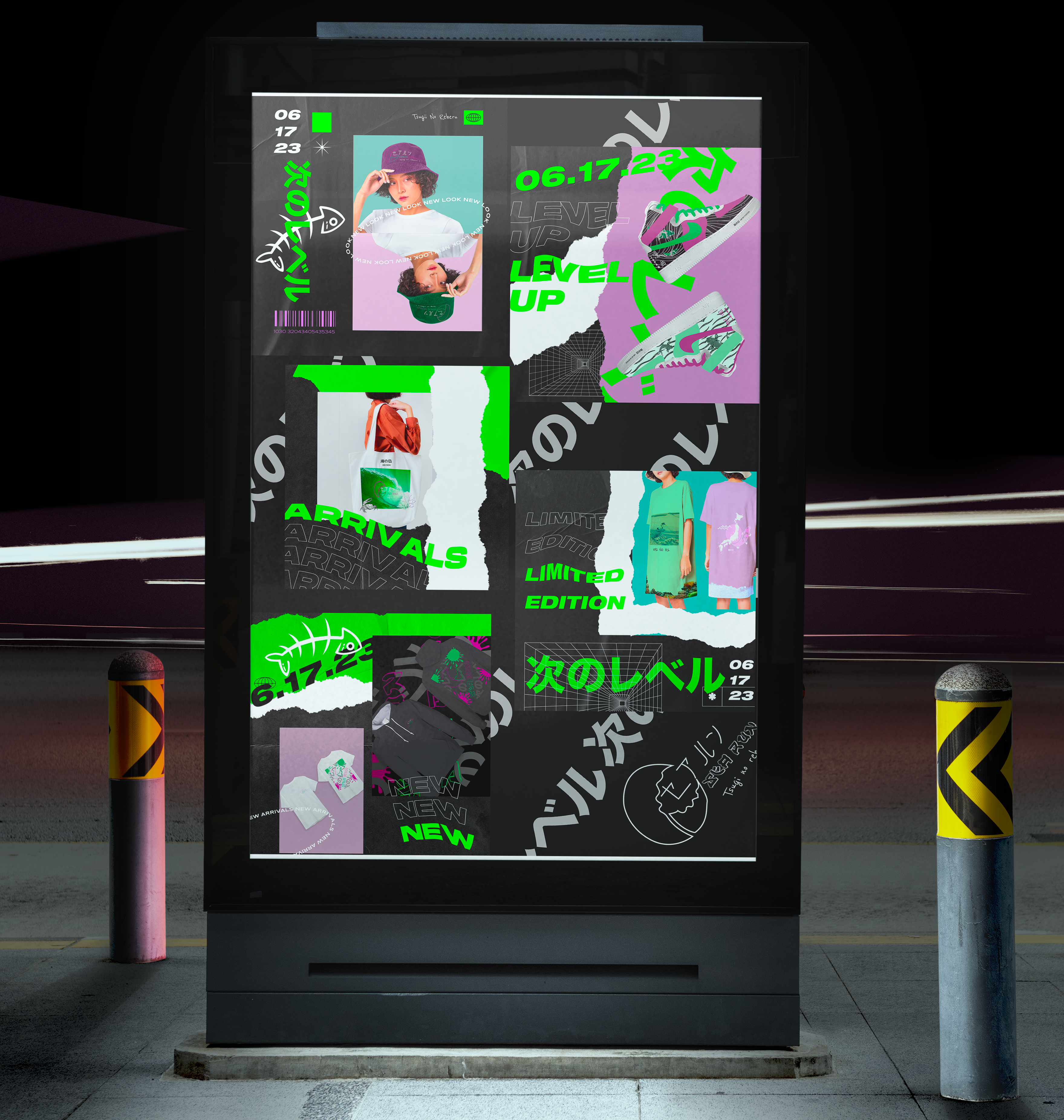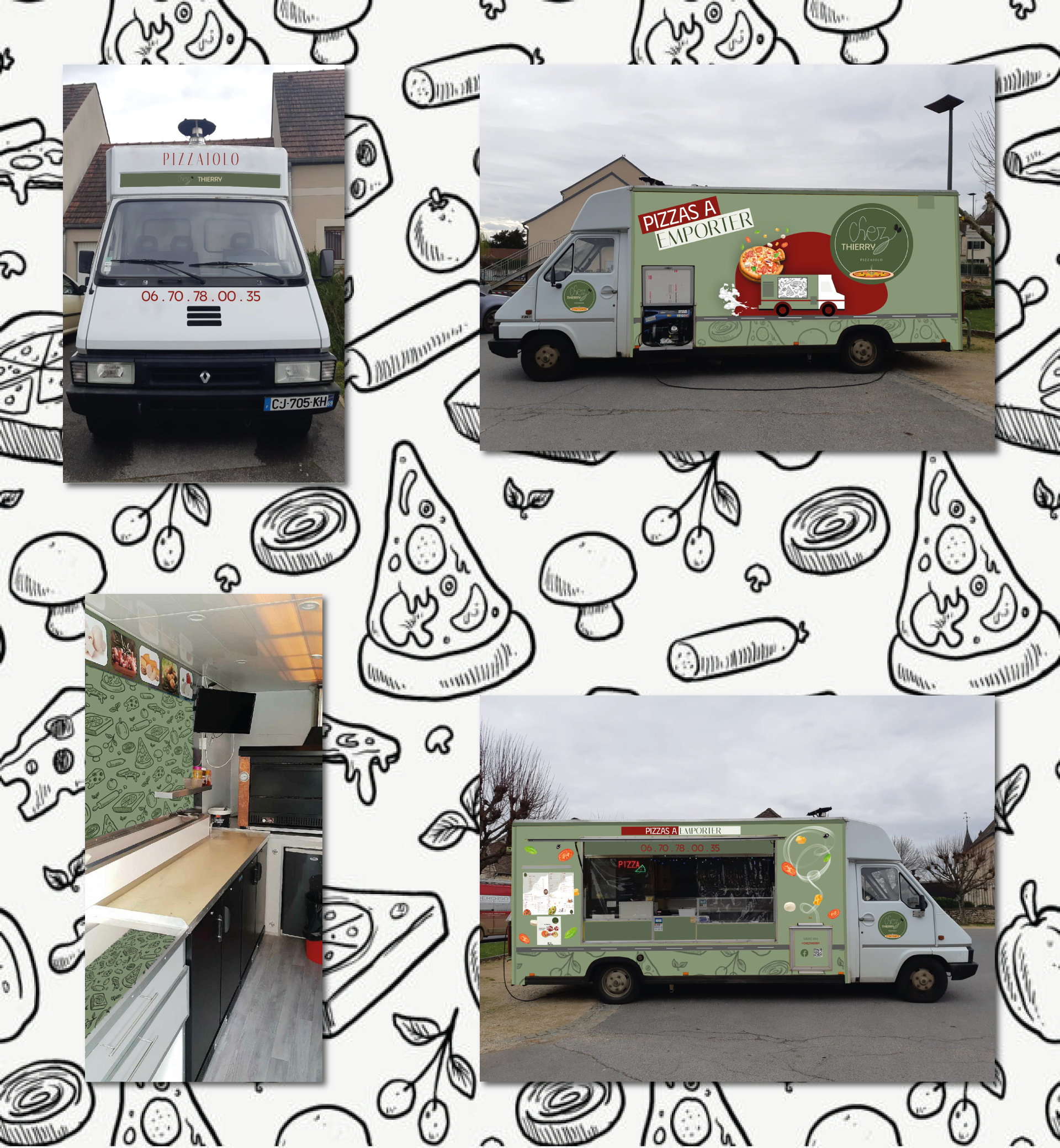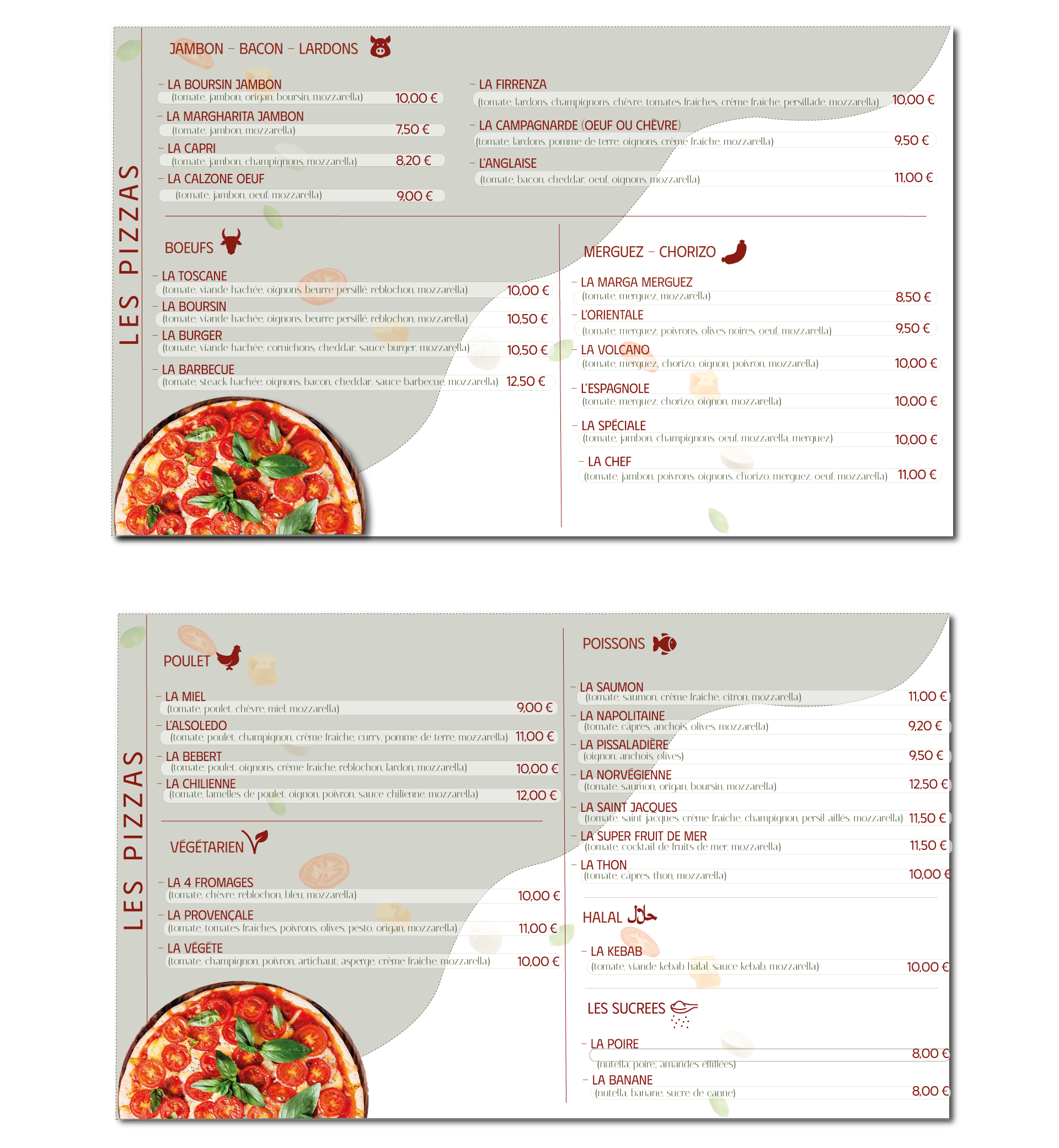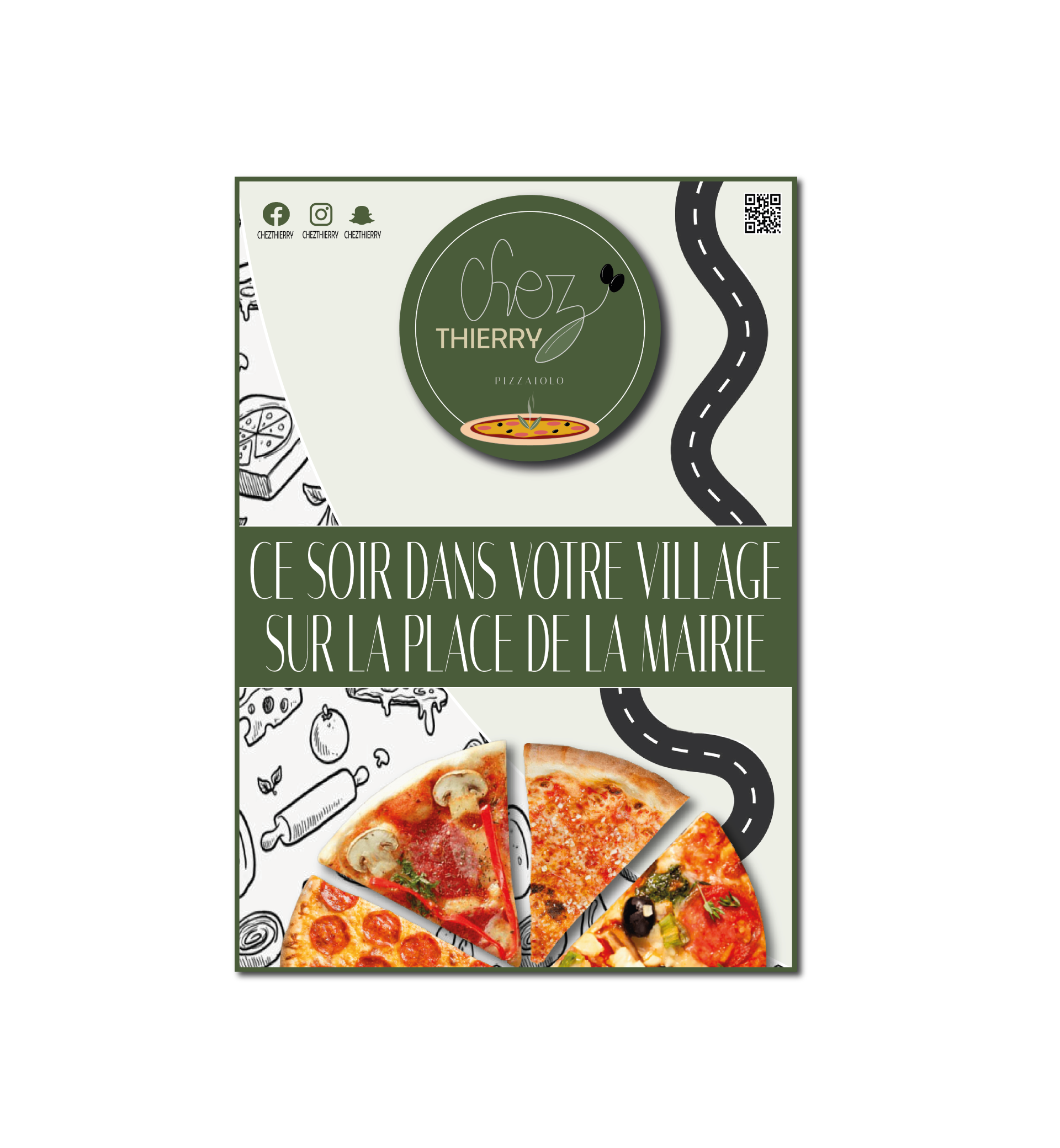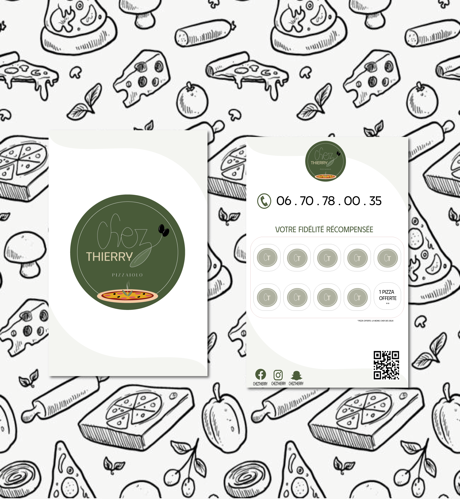 T-Shirts, Casquettes, Boîte à pizzas, Carte de visite et panneau d'affichage.