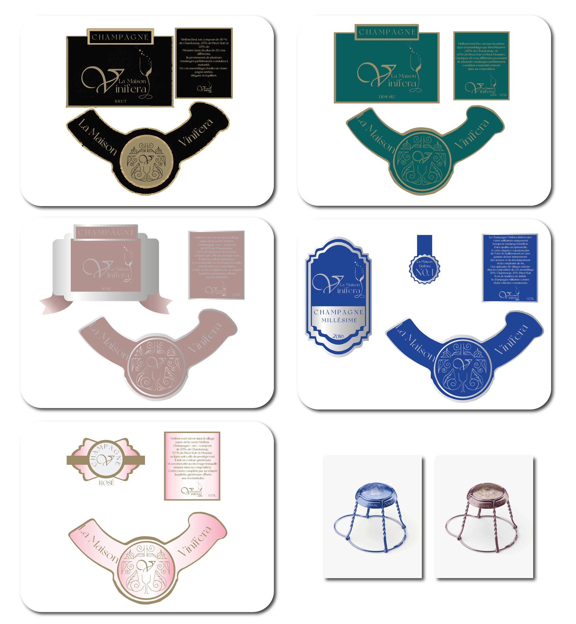 Création des étiquettes pour les différentes bouteilles et des capsules pour le millésime et la cuvée spéciale, les autres bouteilles ont une capsules en cire (voir mise en situation).